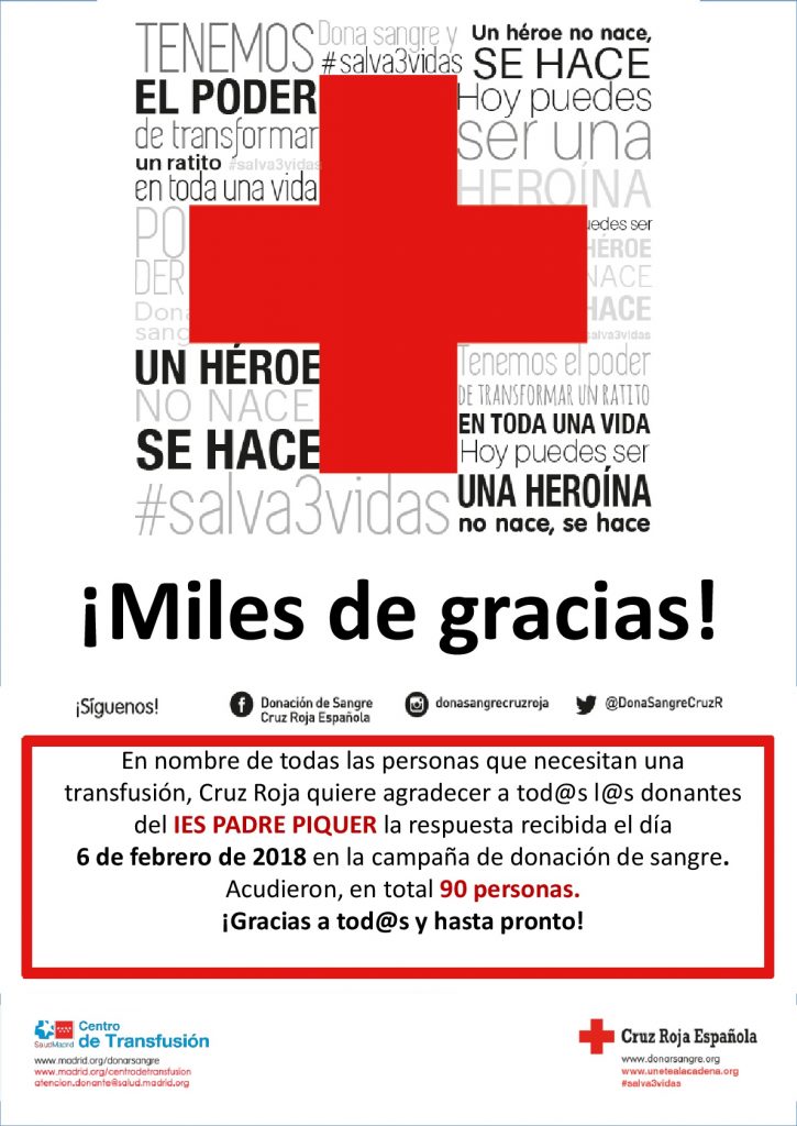 La campaña de donación de sangre realizada por Cruz Roja en nuestro centro, recibió una respuesta muy muy positiva. 90 alumnos, profesores y personal del centro acudieron a la donación. Una respuesta que la propia Institución ha querido agradecer, realizando el cartel que encabeza esta noticia, entre otros mensajes de agradecimientos.