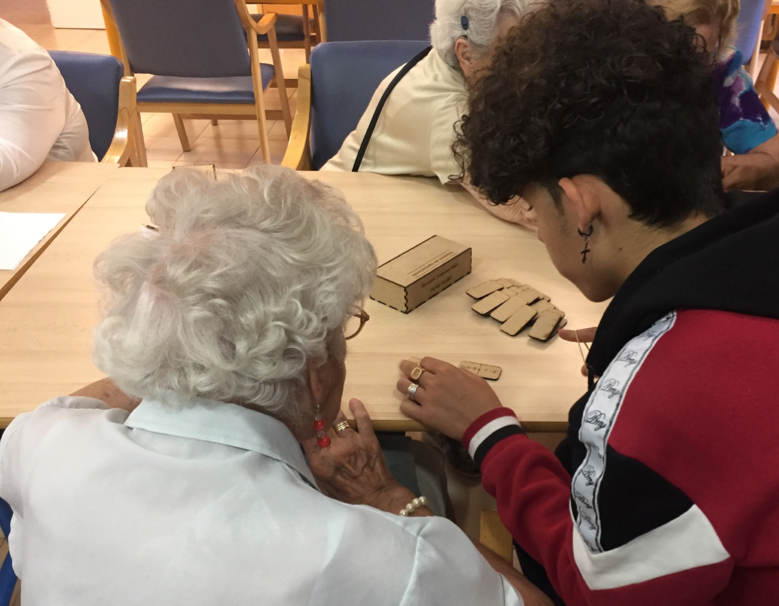 El pasado mes de Junio, nuestros alumnos de Formación Profesional Básica visitaron la residencia de las Hermanas Hospitalarias de Jesús Nazareno. Allí, pudieron disfrutar de un tiempo muy enriquecedor compartiendo experiencias con las ancianas. Además, los alumnos les hicieron entrega de unos juegos de mesa en forma de dominós de operaciones y pirámides alimenticias que habían diseñado y fabricado ellos mismos en las clases de Ciencias Aplicadas utilizando una cortadora láser disponible en el espacio GarageLab codiseñado con Fundación Orange. Los alumnos han podido así aprender realizando un servicio por su comunidad, en el barrio, dándose cuenta del potencial que tienen para, dando lo mejor de sí mismos, hacer de este mundo un lugar mejo