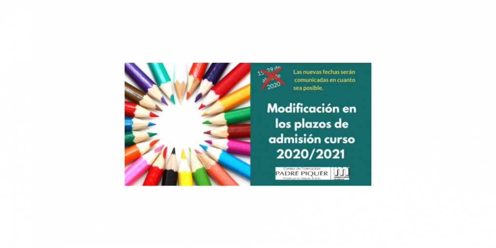 La Consejería de Educación de la Comunidad de Madrid, ha emitido un comunicado a los centros escolares concertados en los que anuncia que se modifican plazos de admisión del curso 2020/2021 para las etapas de Infantil, Primaria, ESO y Bachillerato. Éstos contemplaban que el periodo de presentación de solicitudes de admisión por parte de las familias tuviera lugar entre el 15 y el 29 de abril de 2020, ambas fechas inclusive. Las nuevas fechas serán oportunamente comunicadas a los centros educativos y familias madrileñas cuando sea posible determinarlas con razonable seguridad.