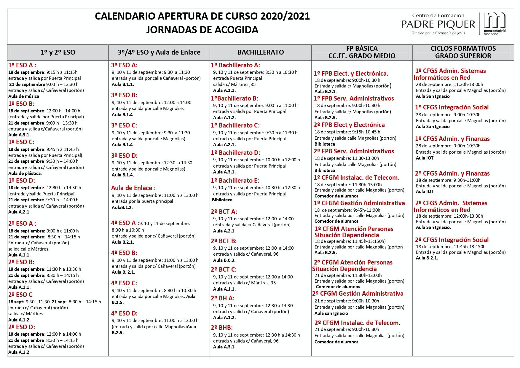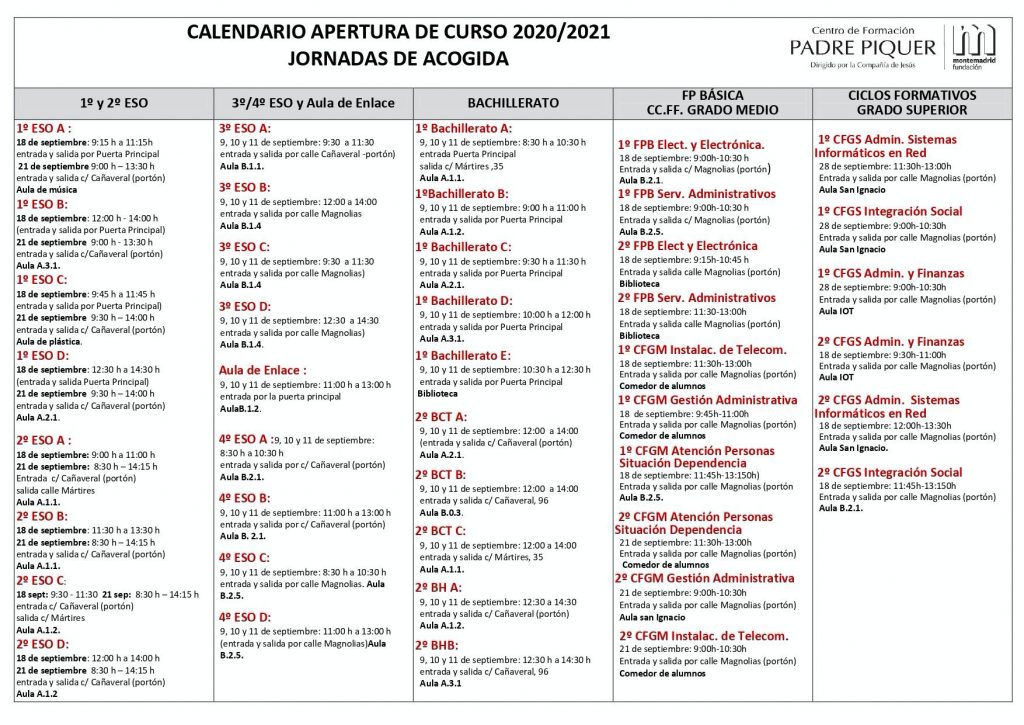 En el documento adjunto pueden ver los horarios de las Jornadas de Acogida, que serán el día 9 de septiembre. Tendrán un horario similar también los días 10 y 11 de septiembre. Van a recibir Uds. un correo individualizado a la dirección de los padres en las que les informaremos de quién es el tutor/a de su hijo/a, en qué grupo-clase está para saber la hora de comienzo de su grupo.