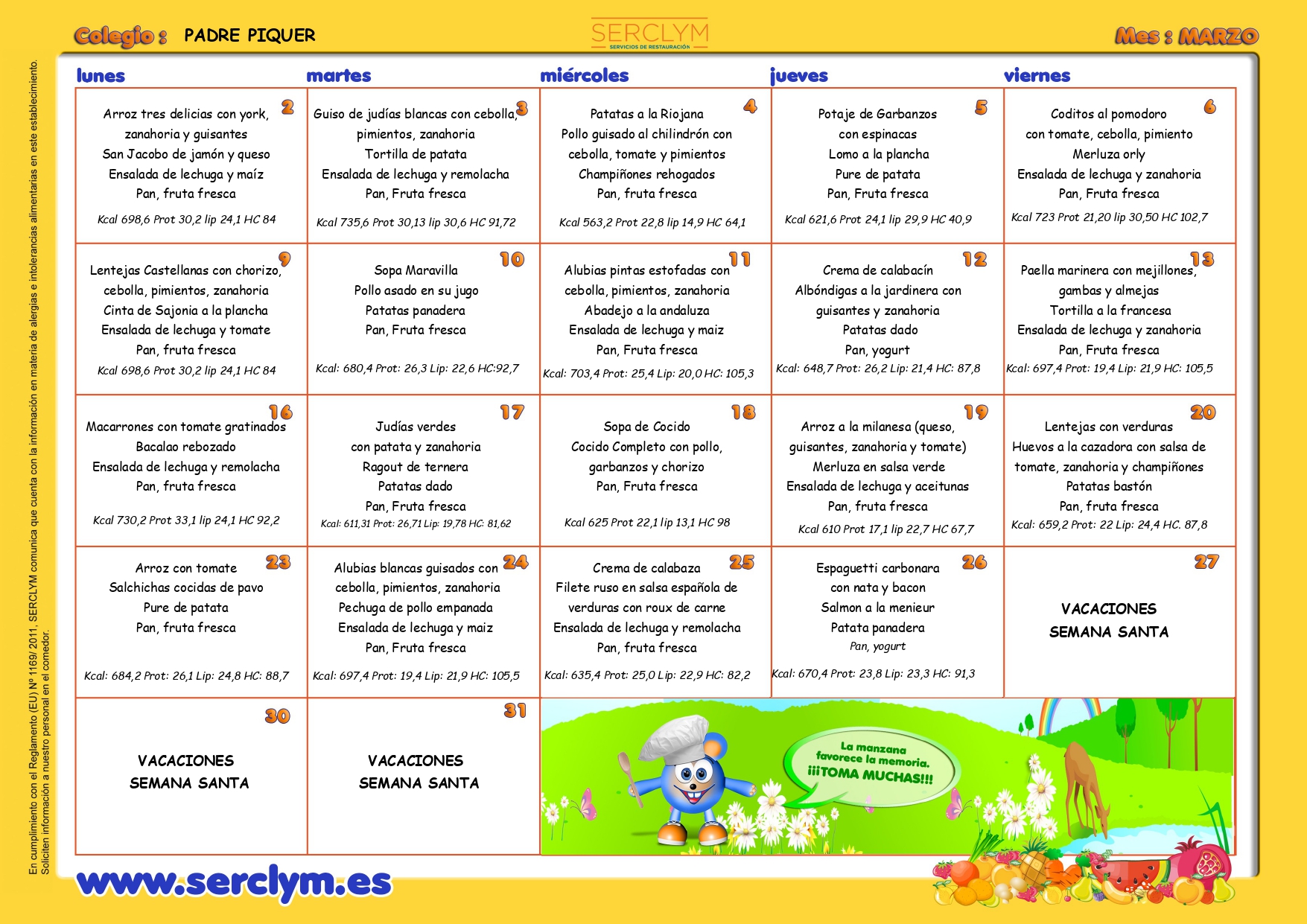 El comedor es un servicio que se ofrece de lunes a viernes para cualquier alumno que lo solicite. SERCLYM es la empresa de restauración que, con una experiencia de más de 30 años, da de comer a unos 100 chicos y chicas cada día ofreciéndoles una dieta equilibrada y variada y trabajando con ellos hábitos de vida saludables. Accede al menú de marzo